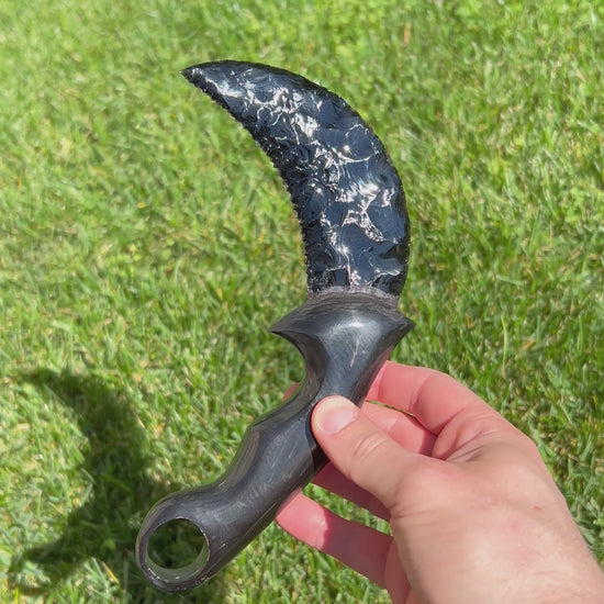 Thi Karambit is a great juxtaposition of two natural materials: Obsidian and buffalo horn. The handle is hand-carved from buffalo horn and the blade is one I made from beautiful glassy-black obsidian.