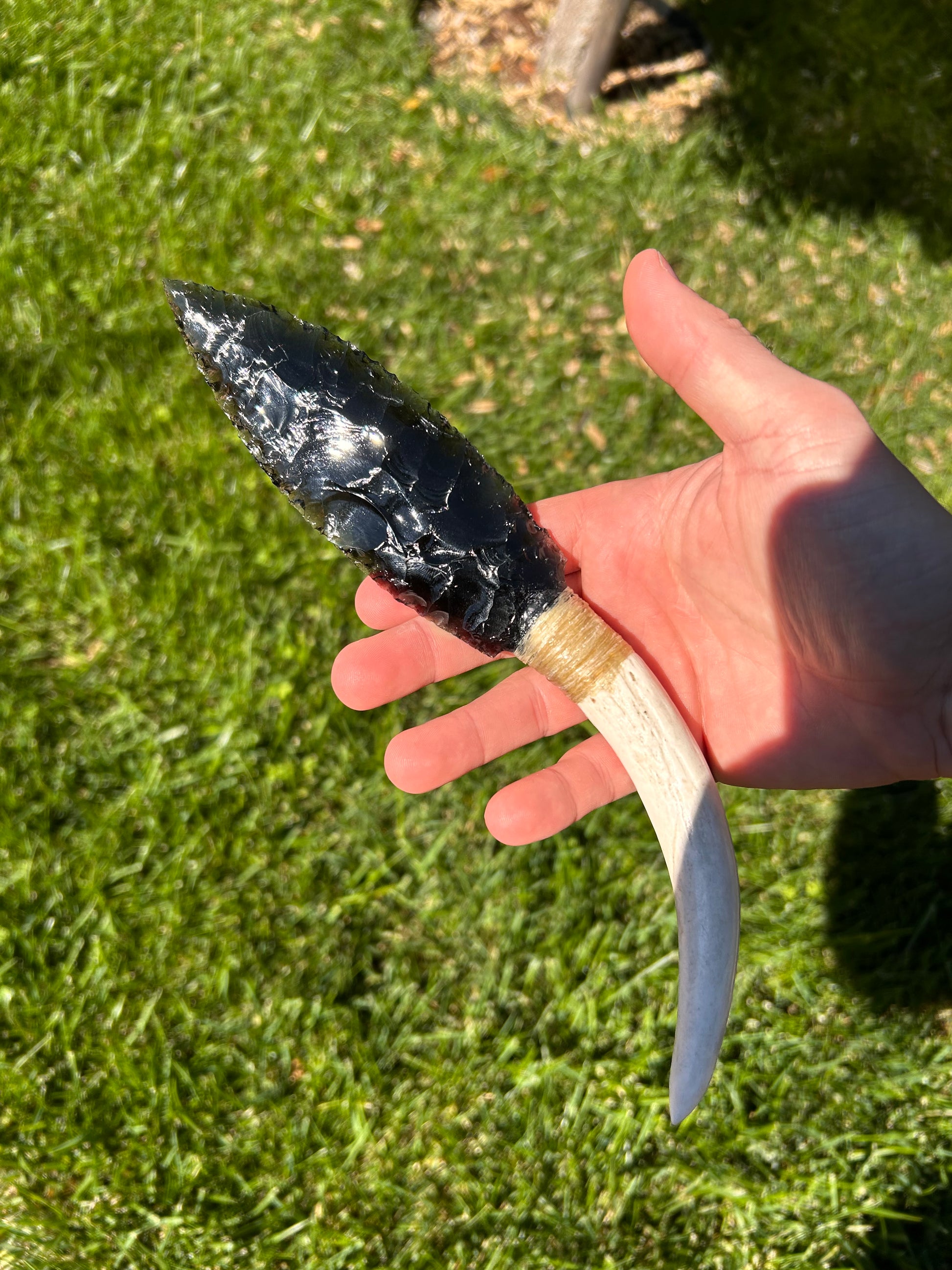 The blade is transparent black obsidian, and the handle is a deer antler spike. The knife has been wrapped and secured with real deer sinew and traditional hide glue.