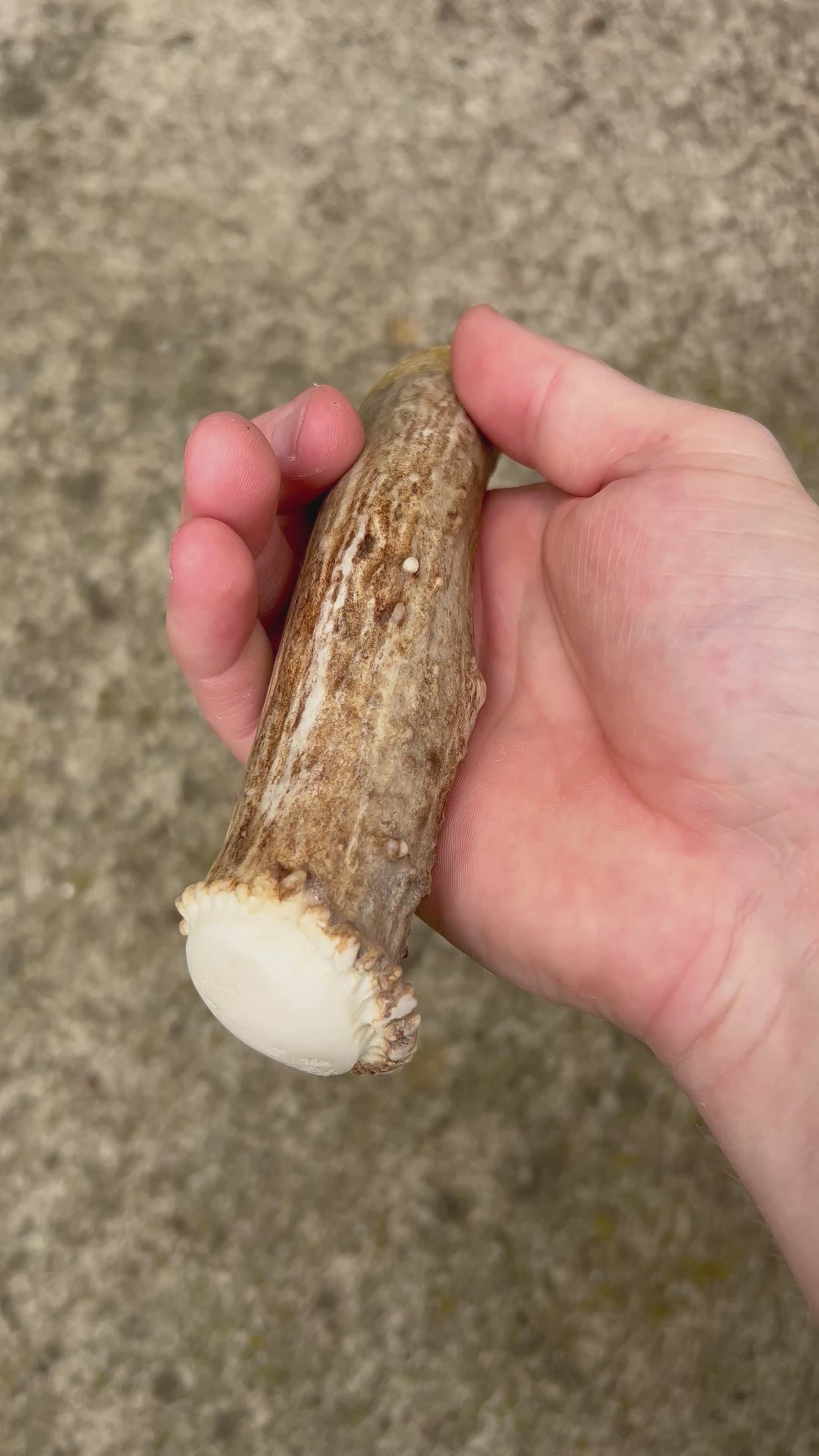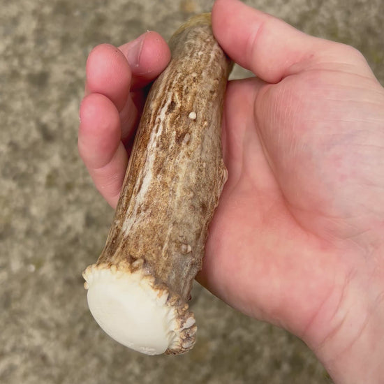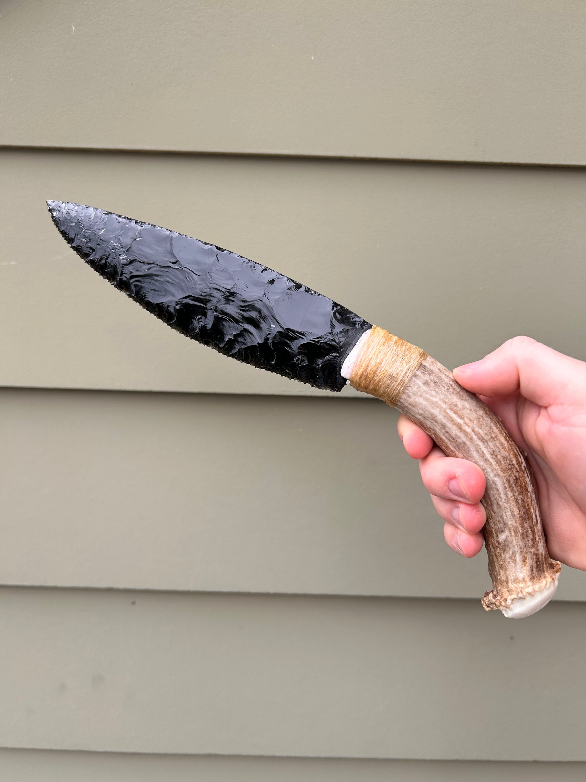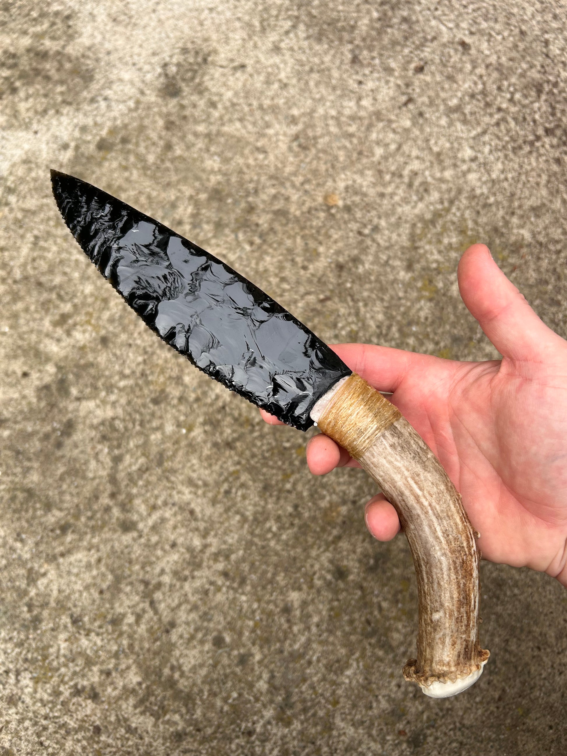 This is a beautiful deep black obsidian knife with a handle from a Mule Deer antler shed. The handle has natural pearling which makes for a smooth yet firm grip in the hand. The blade and handle are joined together with real deer sinew and waterproofed with beeswax.
